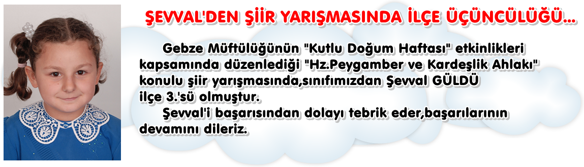 Anasayfa 4-B Sınıfı Haber Arşivimiz ŞEVVAL'DEN ŞİİR YARIŞMASINDA İLÇE ÜÇÜNCÜLÜĞÜ